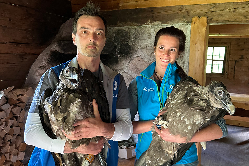 Bereits zum vierten Mal haben der bayerische Naturschutzverband LBV (Landesbund für Vogel- und Naturschutz) und der Nationalpark Berchtesgaden zwei junge, noch nicht flugfähige Bartgeier in einer Felsnische im Klausbachtal erfolgreich ausgewildert.
